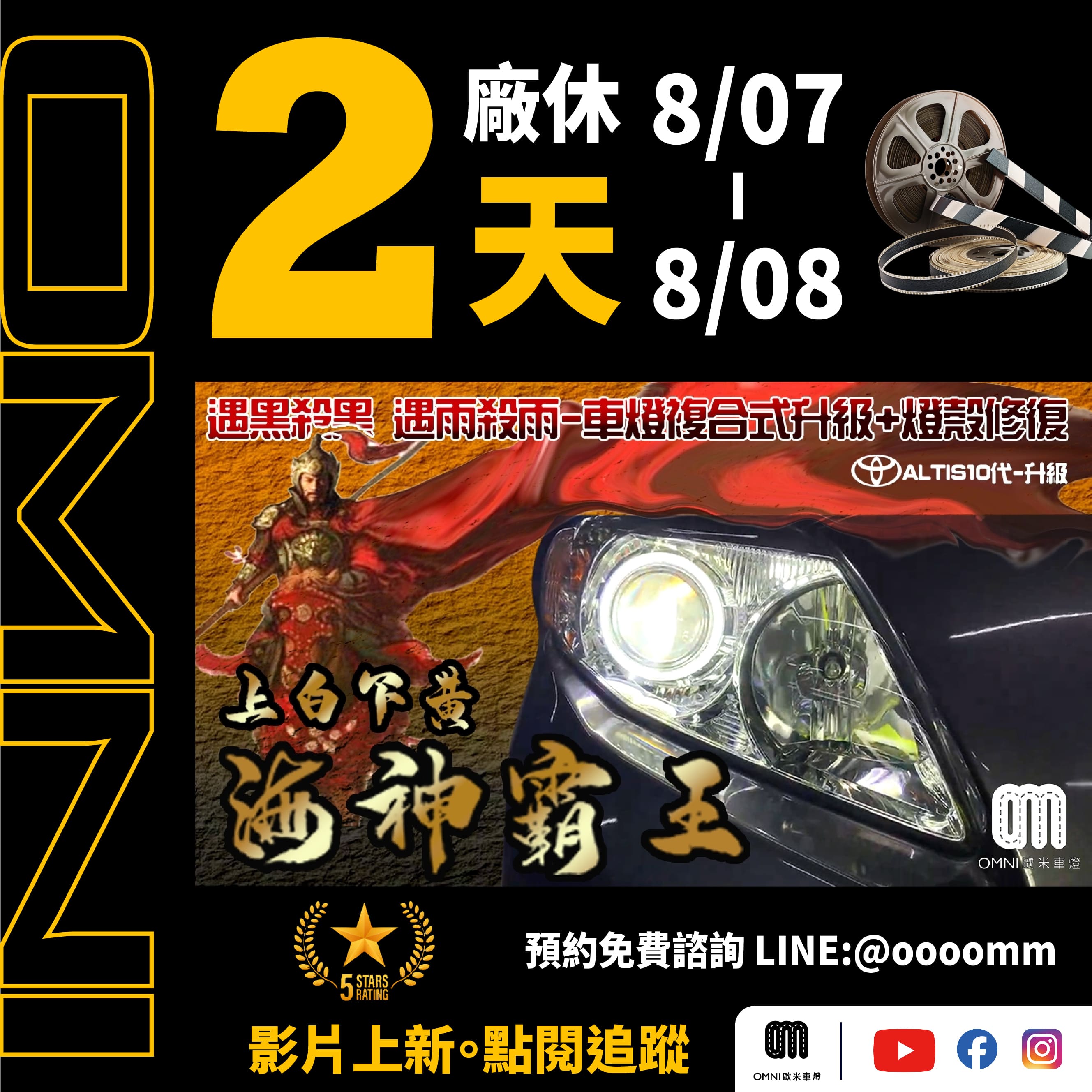 | 8/7(三)+8/8(四)廠休2天, ALTIS 10代大燈升級上新-"上白下黃 海神霸王"遇黑殺黑 遇雨殺雨